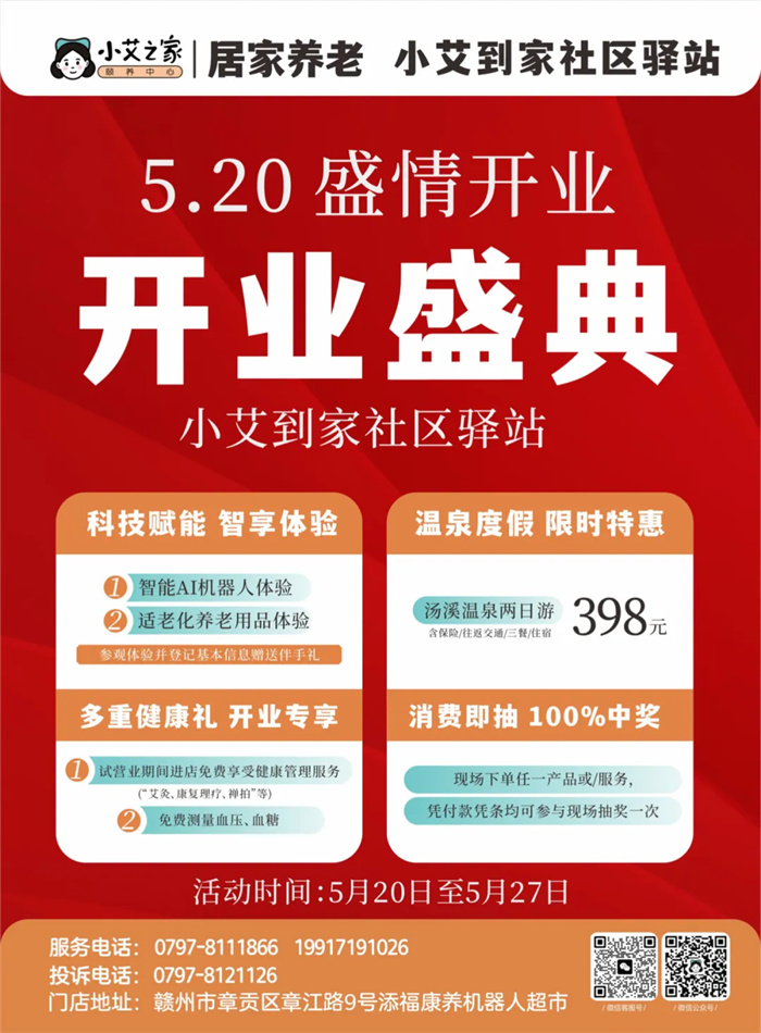 随着社会的发展,老龄化问题日益凸显,如何让老年人安享幸福、健康的晚年生活,已成为我们共同关注的重要课题。为了积极应对老龄化社会的需求,提升社区养老服务品质,小艾到家社区驿站(添福康养机器人超市)——赣州首家养老机器人社区驿站开将于2025年5月20日上午9:00正式开业,为赣州及周边社区居民开启智慧养老新体验,助力老年人乐享安全、便捷、有尊严的晚年生活。